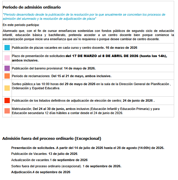 IMPORTANTE: para continuar en el mismo centro en el que se está actualmente escolarizado, no se requiere participar en el proceso de admisión, excepto en el caso de Cambio del 1º al 2º ciclo de Educación Infantil para poder continuar en el mismo centro.